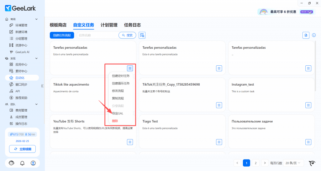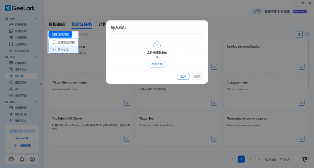 在 GeeLark 最新版本中,你可以通過自動化-自定義任務(wù)中導(dǎo)入導(dǎo)出 GAL(GeeLark Automation Language)文件進(jìn)行獲取/分享模板。