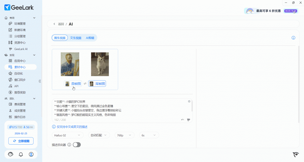 在 GeeLark 最新版本中,Hailuo 02 大模型也支持首尾幀圖片生成視頻了。你可以通過自己的需求選擇合適的AI大模型,上傳不同的首幀和尾幀圖,通過文字描述讓AI生成符合你運營領(lǐng)域的視頻內(nèi)容。