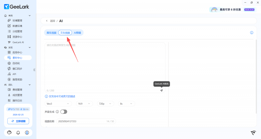 在 GeeLark 最新版本中,素材中心 - AI 模塊新增了「文生視頻」功能,文生視頻可以快速生成產(chǎn)品宣傳片、廣告創(chuàng)意視頻,只需輸入文字描述,就能生成一段視頻。