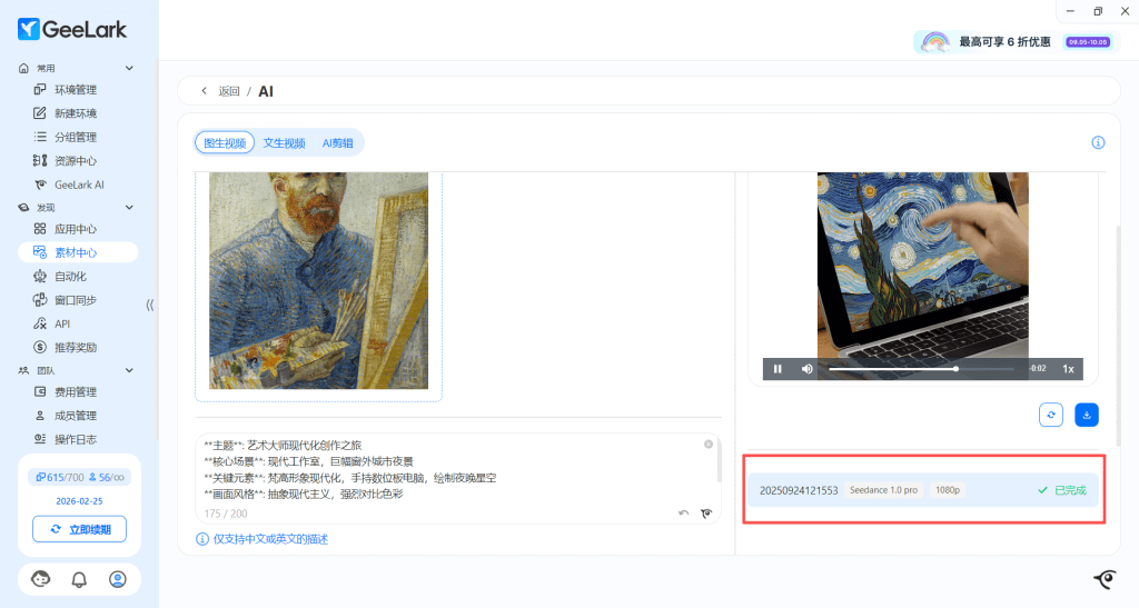 你可以選擇 Veo3/Seedance 1.0 Pro/KLING 2.1 Master/Hailuo 02/Seedance 1.0 lite 大模型完成你的文生視頻任務(wù),并通過 GeeLark AI 優(yōu)化文案,不斷調(diào)整提示詞,輕松生成不同藝術(shù)風(fēng)格(如油畫、水彩、賽博朋克)。