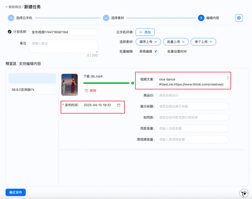 3.選擇云手機(jī)環(huán)境,并按照如下的格式填寫視頻文案:標(biāo)題 # Geelink : 錨點(diǎn)鏈接