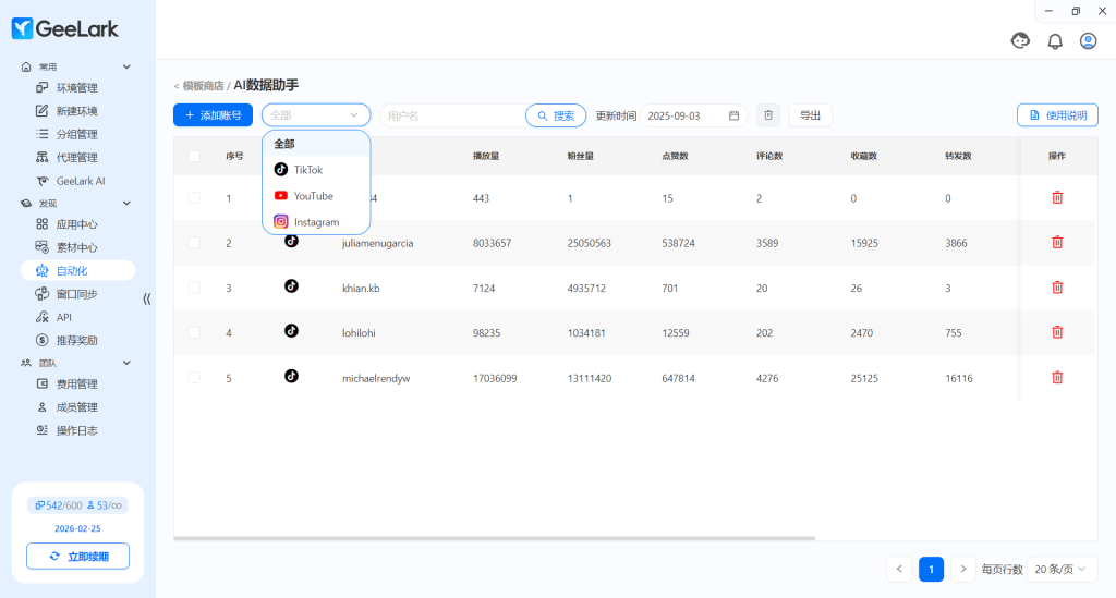 AI 數(shù)據(jù)助手支持查找 TikTok、YouTube、Instagram 賬號(hào)數(shù)據(jù),點(diǎn)擊添加賬號(hào)時(shí)可設(shè)置想要查找的社媒平臺(tái),輸入賬號(hào)信息聚合平臺(tái)數(shù)據(jù)(播放量、點(diǎn)贊、評論、粉絲量等),一目了然。