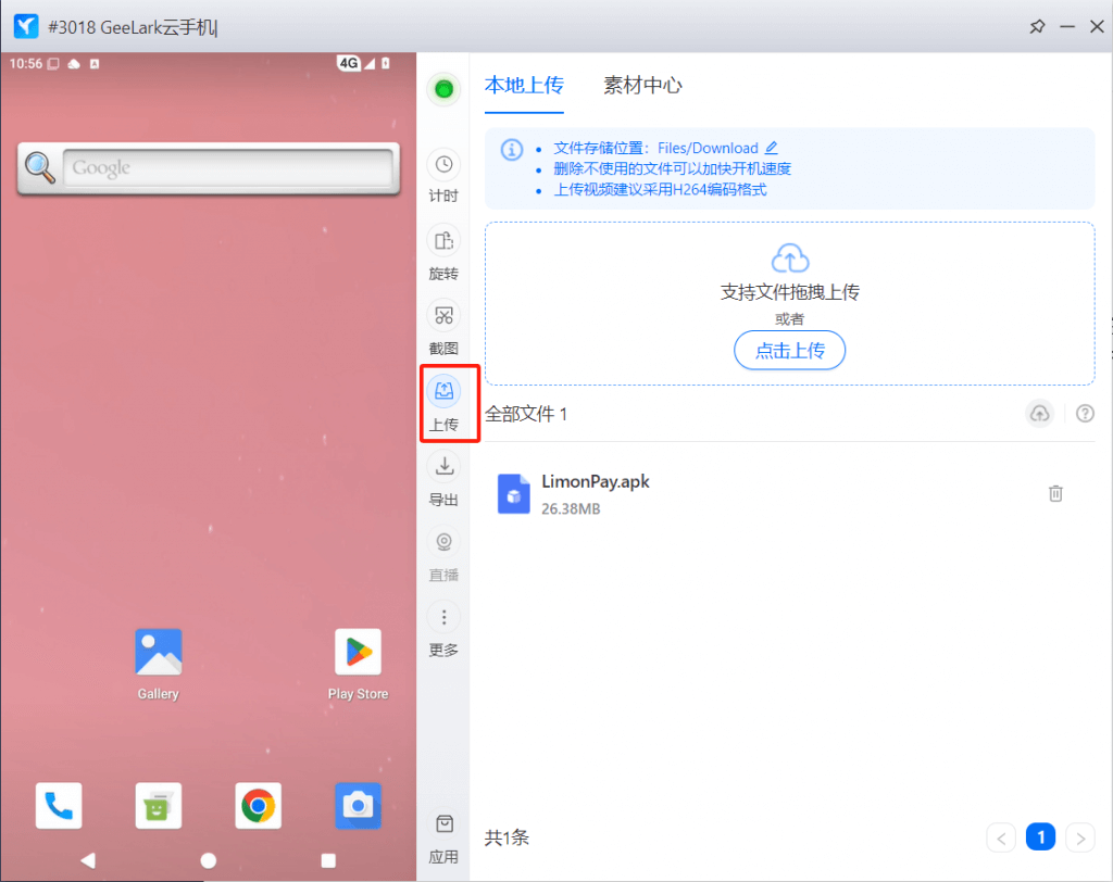 A:在云手機右側(cè)功能欄,點擊上傳-上傳文件,可選取電腦中的圖片/視頻等文件上傳,在云手機中的相冊(Gallery)查看圖片和視頻,在Files查看其他類型文件。
