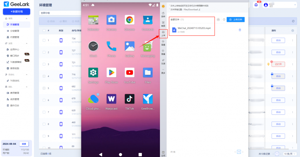 GeeLark的自動清理SD卡數(shù)據(jù)不是指清理云手機所有的數(shù)據(jù),其清理的數(shù)據(jù)是指你在云手機側邊欄【上傳】中上傳到Files/download的文件,包括圖片,視頻等等,但云手機本身的應用信息和緩存數(shù)據(jù)是不會被刪除的。