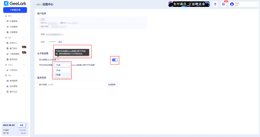 為了滿足不同用戶的需求,GeeLark還為自動清理功能提供了豐富的設置選項。用戶可以根據(jù)自己的實際情況,自行開啟/關閉自動清理SD卡數(shù)據(jù),也可自定義清理時間間隔,確保SD卡數(shù)據(jù)始終保持整潔有序。