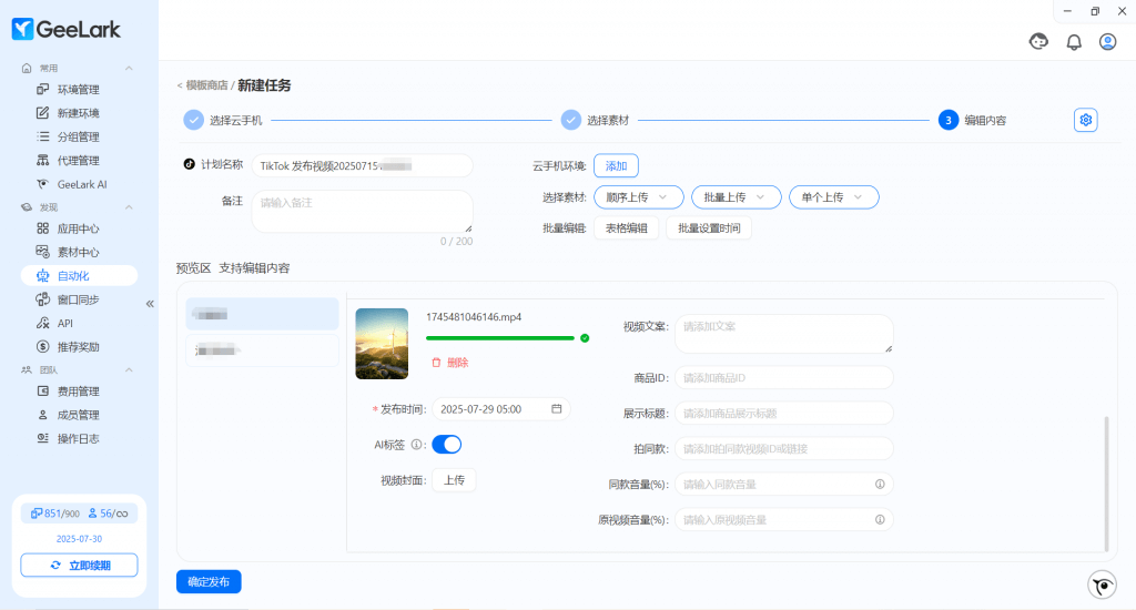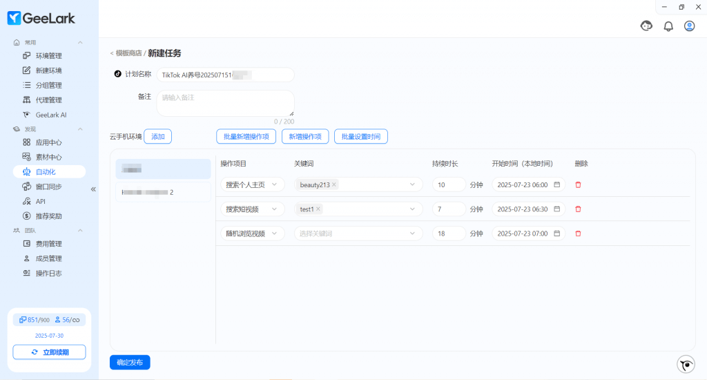 - 已選的云手機(jī)環(huán)境均完成內(nèi)容上傳并設(shè)置發(fā)布時間后,點擊頁面底部“確定發(fā)布”按鈕,即成功發(fā)布任務(wù)。