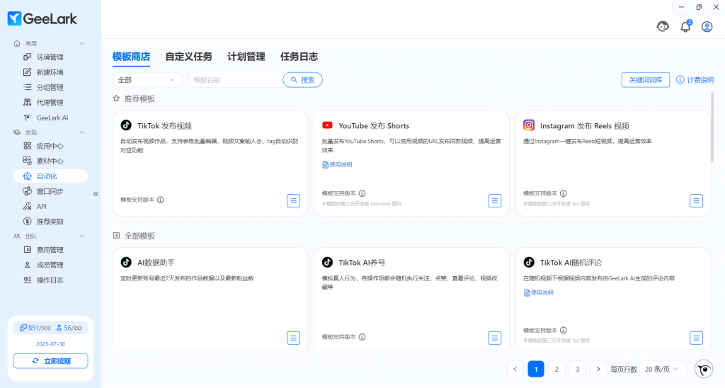 在模板商店里,我們提供由第三方開發(fā)者提供的 RPA 腳本,你可進(jìn)行更加專業(yè)的自動化功能,也可以自定義設(shè)置合適自己運營的相關(guān)任務(wù)。如果有開發(fā)能力的用戶,GeeLark 還支持 API/ADB,實現(xiàn)更精準(zhǔn)的自動化需求。