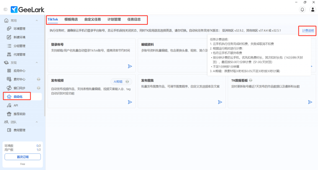 首先,進入GeeLark點擊左邊“自動化”欄目,你可選擇各項TikTok自動化功能。