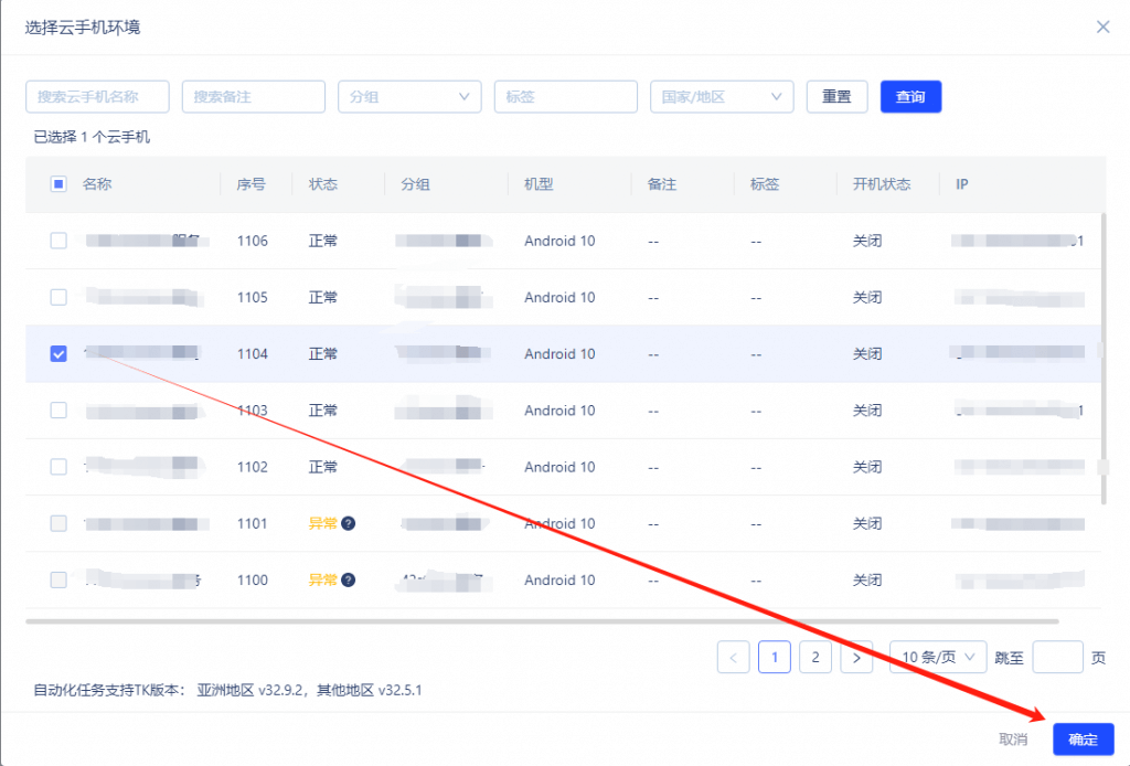 - 自動化任務(wù)支持TK版本:亞洲地區(qū) v32.9.2 或v37.4.4,其他地區(qū) v37.4.4 或 v32.5.1,如果自行安裝了其他版本或首次創(chuàng)建的云手機環(huán)境未安裝TK,云手機狀態(tài)會為異常而無法選擇。
