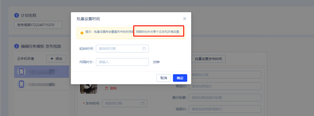 特別提示:不同云手機可同時執(zhí)行任務(wù),故批量設(shè)置時間中的起始時間針對每一個云手機環(huán)境設(shè)置。