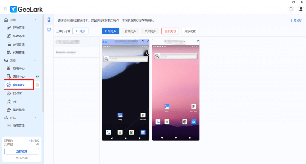 首先,點擊左邊“窗口同步”,選擇你要開始同步的云手機環(huán)境,各窗口打開后點擊“開始同步”,完成操作。
