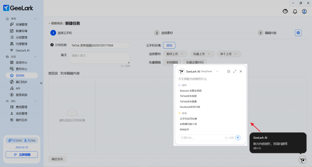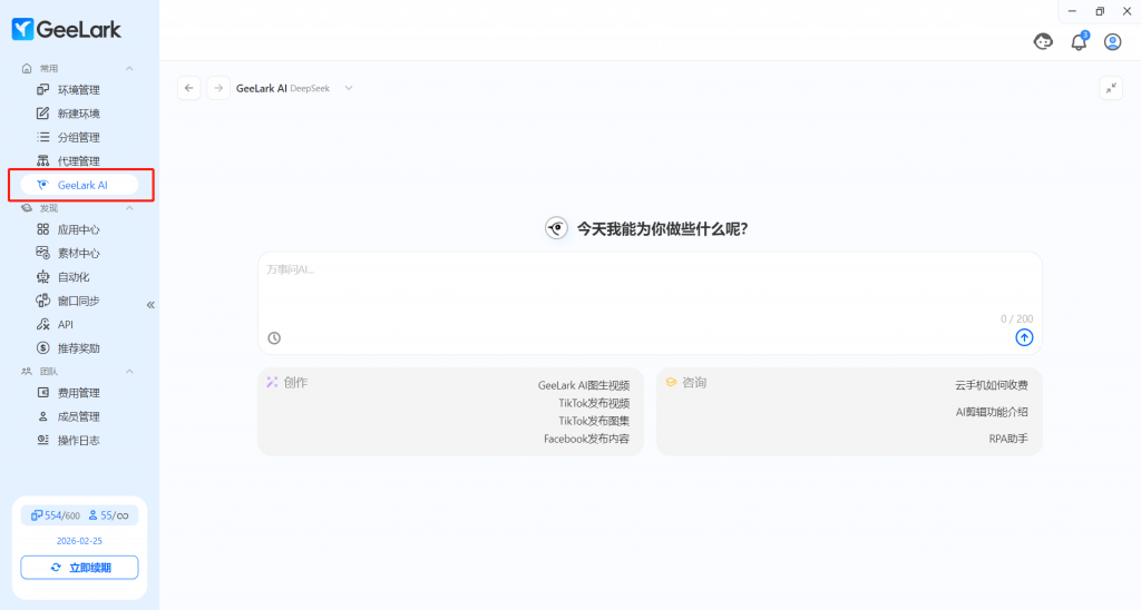 在今年4月,GeeLark AI 全面接入 DeepSeek AI 大模型,你可以在獨立窗口中便捷地使用 GeeLark AI。除了幫助你編寫文案等基礎(chǔ)內(nèi)容,在使用 GeeLark 過程中,如果遇到問題,也可以通過詢問 GeeLark AI,及時獲取幫助。