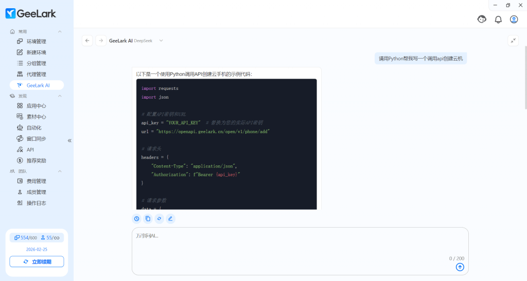 如詢問“用 Python 調(diào)用 API 創(chuàng)建云手機”,通過 GeeLark AI 能快速調(diào)試,解釋復雜 API 的用法,幫助非資深開發(fā)者快速上手。