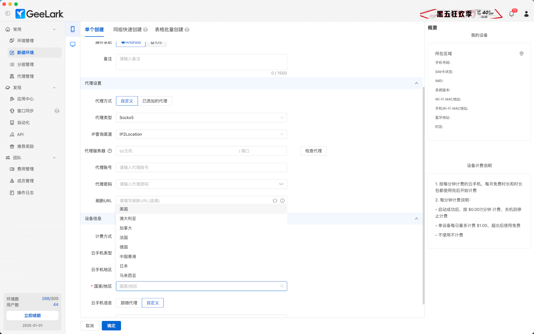 在GeeLark中,有兩種方式創(chuàng)建具體定位的云手機(jī),你可以選擇智能匹配或者自定義地區(qū):