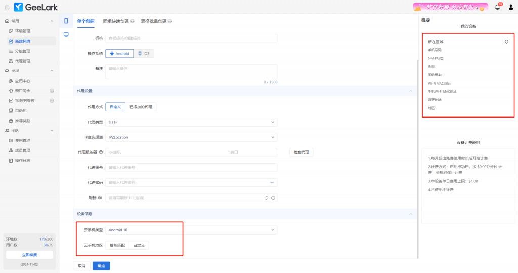 1、智能匹配。當(dāng)你創(chuàng)建環(huán)境時(shí),填寫(xiě)好代理信息,并點(diǎn)擊【智能匹配】,GeeLark將會(huì)根據(jù)你填寫(xiě)的代理信息,在云端自動(dòng)創(chuàng)建該地區(qū)定位的云手機(jī)環(huán)境;