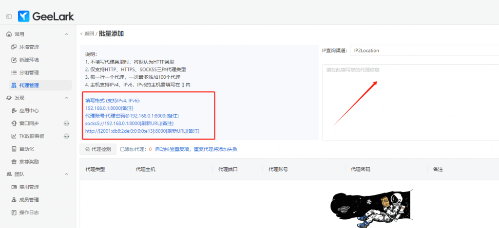 2、如果你購(gòu)買(mǎi)的代理較多,可以點(diǎn)擊【代理管理】菜單,并點(diǎn)擊菜單中的【添加代理】,將網(wǎng)絡(luò)服務(wù)提供商提供代理信息粘貼到右側(cè)的輸入框中,GeeLark會(huì)自動(dòng)識(shí)別,通過(guò)代理檢測(cè)后會(huì)自動(dòng)添加到代理管理列表中;