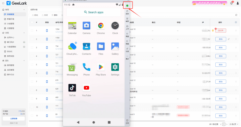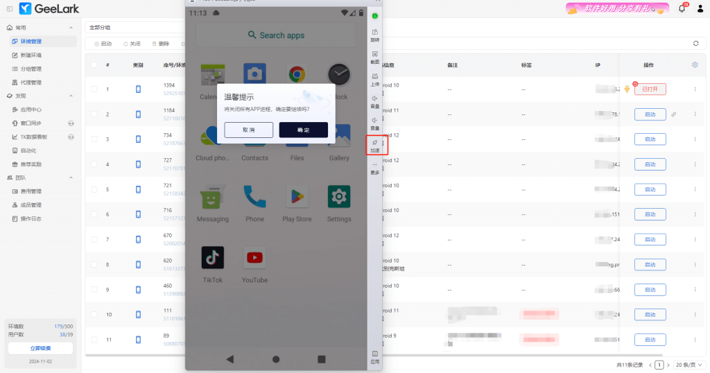 2、同一時(shí)間運(yùn)行過(guò)多的應(yīng)用。和實(shí)體手機(jī)一樣,在使用過(guò)程中如果同時(shí)打開(kāi)過(guò)多的應(yīng)用,也會(huì)導(dǎo)致云手機(jī)的運(yùn)行效率降低,你可以適當(dāng)關(guān)閉部分應(yīng)用以提高運(yùn)行速度。此外,GeeLark還提供了一鍵加速功能,你可以點(diǎn)擊菜單右側(cè)的加速按鈕,一鍵關(guān)閉全部APP進(jìn)程。需要注意的是,如果你正在通過(guò)云手機(jī)編輯內(nèi)容,請(qǐng)及時(shí)保存相關(guān)進(jìn)度,以免造成進(jìn)度丟失。