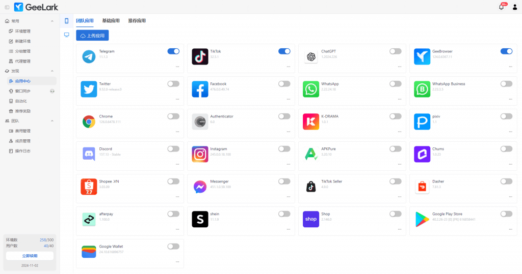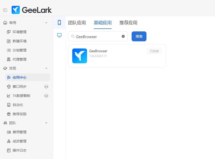 版本更新后,GeeLark不會(huì)自動(dòng)安裝TikTok應(yīng)用,你需要先到「應(yīng)用中心」的「基礎(chǔ)應(yīng)用」中搜索TikTok并選擇安裝,再在團(tuán)隊(duì)?wèi)?yīng)用中點(diǎn)擊安裝,TikTok就會(huì)安裝在所有云手機(jī)上啦