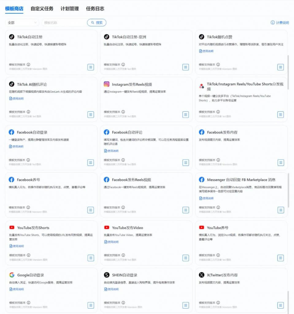 GeeLark 自動(dòng)化不僅有支持 TikTok 的相關(guān)模板,包括但不限于上述講述的功能和 TikTok 批量登錄注冊(cè)等等,還對(duì)于運(yùn)營(yíng)海外各大社媒平臺(tái)均有自動(dòng)化腳本支持,如 X(Twitter)、Meta(Facebook)、Instagram、YouTube 等。