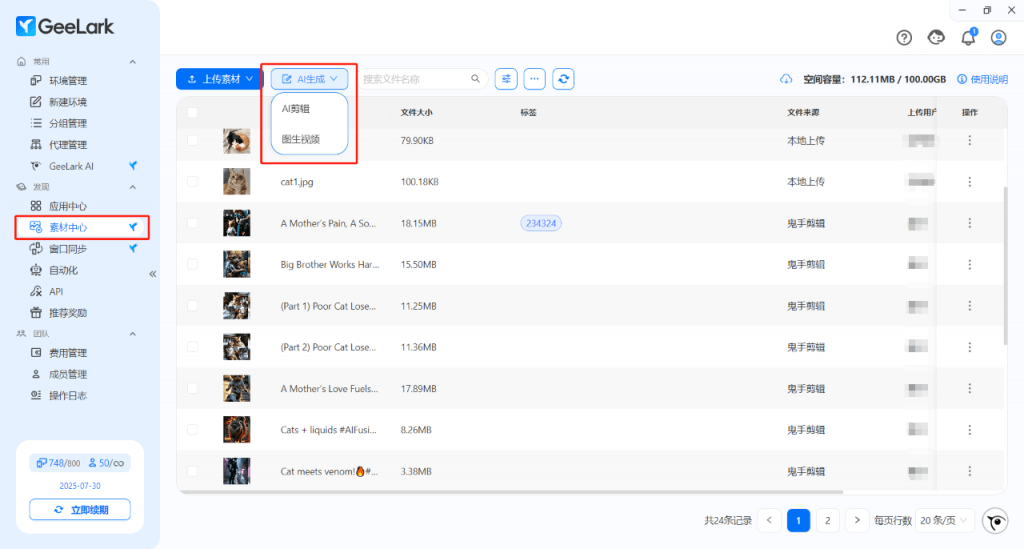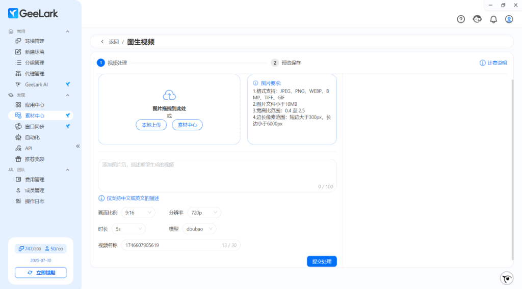 GeeLark AI 添加了全新的圖生視頻功能,通過素材中心- AI 生成-選擇“圖生視頻”,支持拖拽/本地上傳/素材中心選擇圖片,運(yùn)用AI技術(shù)把圖片變成視頻進(jìn)行發(fā)布。視頻生成成功后,會(huì)自動(dòng)同步至素材中心。