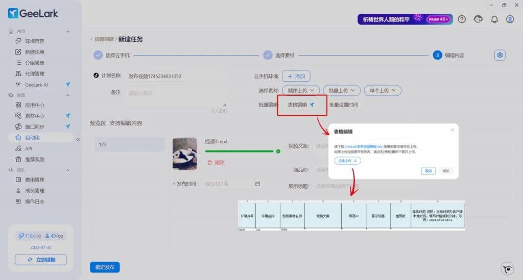你也可以點(diǎn)擊【表格編輯】,在Excel表格中輸入以上內(nèi)容,并【點(diǎn)擊上傳】,內(nèi)容會(huì)被自動(dòng)識(shí)別并批量自動(dòng)導(dǎo)入到云手機(jī)頁(yè)面。與素材編輯一樣,你也可以通過表格編輯一鍵設(shè)置視頻文案等信息。