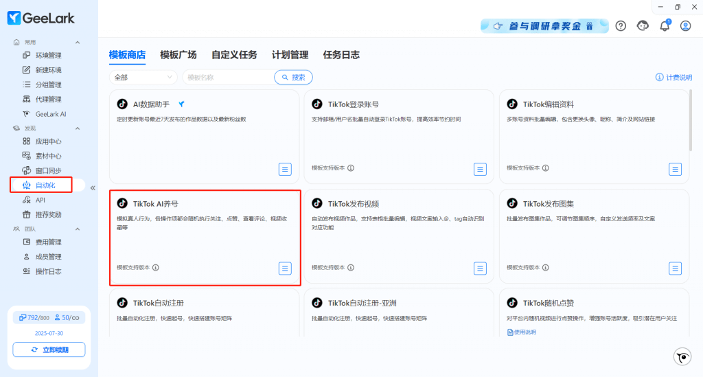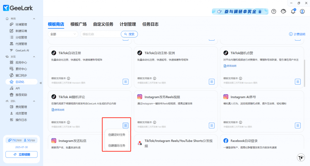 在模板商店里,我們提供由第三方開發(fā)者提供的 RPA 腳本,你可進(jìn)行更加專業(yè)的自動(dòng)化功能,也可以自定義設(shè)置合適自己運(yùn)營(yíng)的相關(guān)任務(wù)。