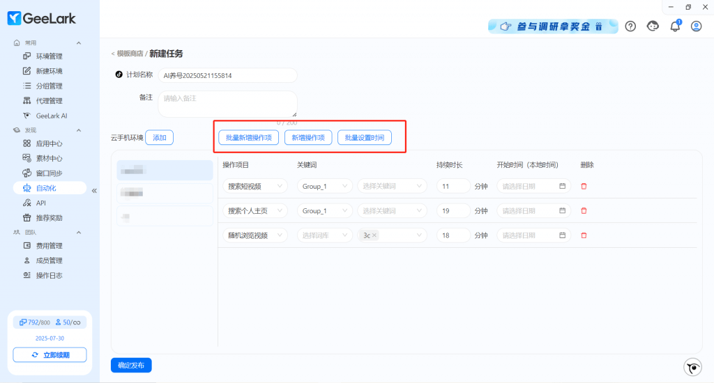 已選的云手機(jī)環(huán)境均完成上傳視頻并設(shè)置發(fā)布時(shí)間后,點(diǎn)擊頁(yè)面底部【確定發(fā)布】按鈕,即成功發(fā)布任務(wù)。