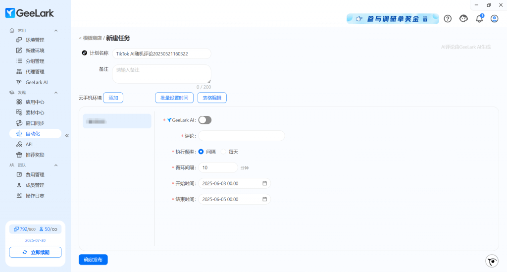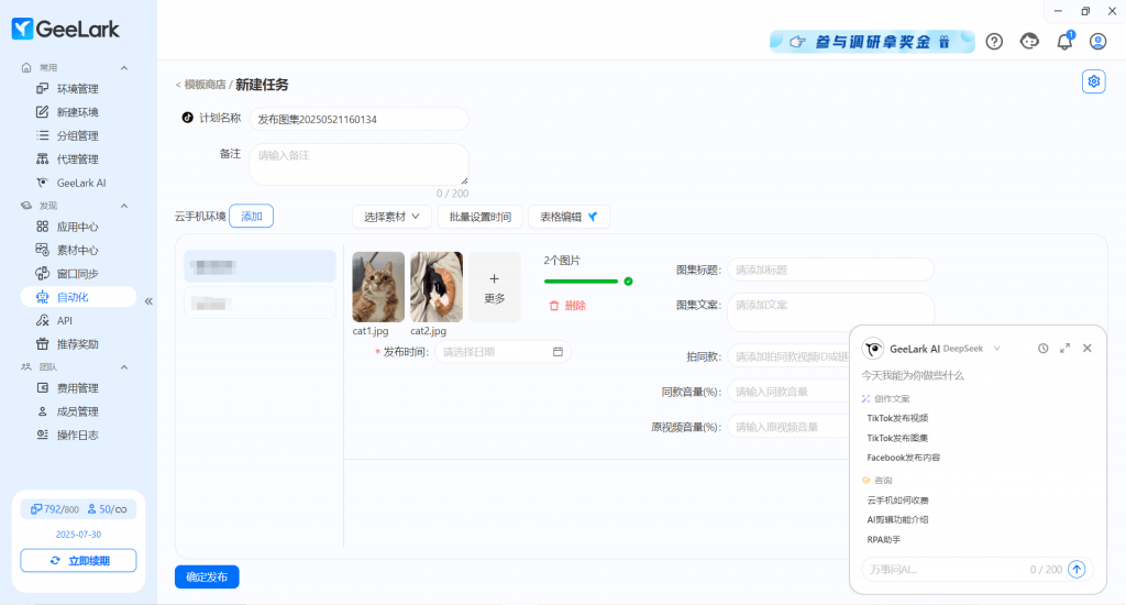 - 設(shè)置發(fā)布時(shí)間,隨后點(diǎn)擊下方【確定發(fā)布】,任務(wù)即為成功發(fā)布。 同時(shí)你也可以喚醒 GeeLark AI ,巧妙協(xié)助你的圖集文案編寫。