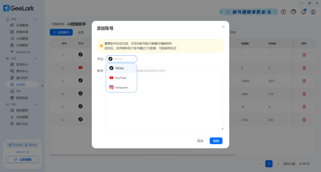 AI 數(shù)據(jù)助手功能支持查找 Instagram & YouTube 賬號(hào)數(shù)據(jù)了,點(diǎn)擊添加賬號(hào)時(shí)可設(shè)置想要查找的社媒平臺(tái),輸入賬號(hào)信息即可查找賬號(hào)最近7天發(fā)布的作品數(shù)據(jù)及最新粉絲數(shù)。
