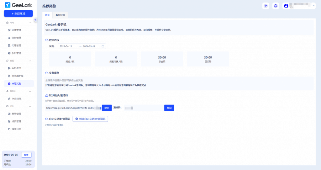詳細(xì)操作步驟請(qǐng)參考:「 邀請(qǐng)好友用 GeeLark,無(wú)限獎(jiǎng)金等你拿 」