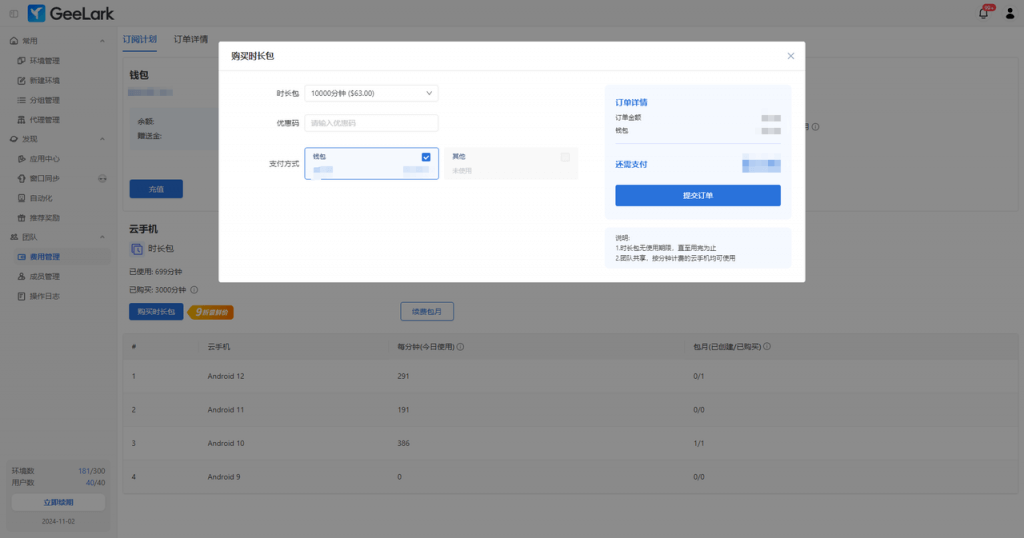 對(duì)于新注冊(cè)用戶我們提供了一些特別福利:贈(zèng)送60分鐘免費(fèi)云手機(jī)使用時(shí)長(zhǎng)及1美元贈(zèng)送金。免費(fèi)時(shí)長(zhǎng)自注冊(cè)日起30天內(nèi)有效,助你充分體驗(yàn)云手機(jī)服務(wù)及GeeLark的自動(dòng)化功能,以便在決定購(gòu)買套餐前深入了解產(chǎn)品。若你在此期間訂購(gòu)套餐,未使用的剩余分鐘數(shù)將自動(dòng)并入新套餐中。