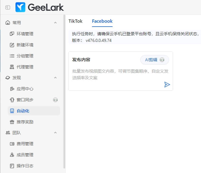 在GeeLark最新版本中,為滿足用戶跨平臺(tái)內(nèi)容分發(fā)需求,我們對(duì)自動(dòng)化功能進(jìn)行了完善。在原有的TikTok自動(dòng)化基礎(chǔ)上,新增Facebook自動(dòng)化功能,支持視頻和圖文發(fā)布,同樣你也可以使用 AI 剪輯功能,對(duì)你發(fā)布的視頻添加隨機(jī)特效,以達(dá)到更好的內(nèi)容分發(fā)效果。