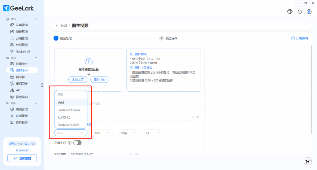 在最新版本中,GeeLark AI 的 AIGC 功能已接入「Seedance 1.0 pro、 KLING 1.6、Veo3大模型」。你可以在視頻生成的基礎(chǔ)設(shè)置中選擇合適的 AI 大模型,結(jié)合其強(qiáng)大的多模態(tài)生成能力和云計(jì)算基礎(chǔ)設(shè)施,提供高效、靈活的視覺(jué)內(nèi)容生產(chǎn)解決方案。