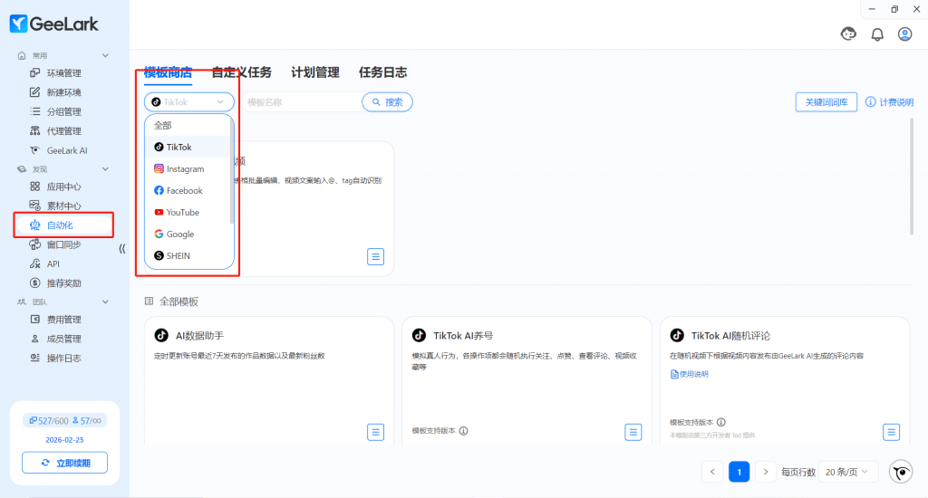 隨著 GeeLark 自動(dòng)化功能支持的平臺(tái)與場(chǎng)景增多,GeeLark 現(xiàn)在支持針對(duì)平臺(tái)篩選,方便你快速定位所需自動(dòng)化腳本,快速定位目標(biāo)平臺(tái)所有模板。