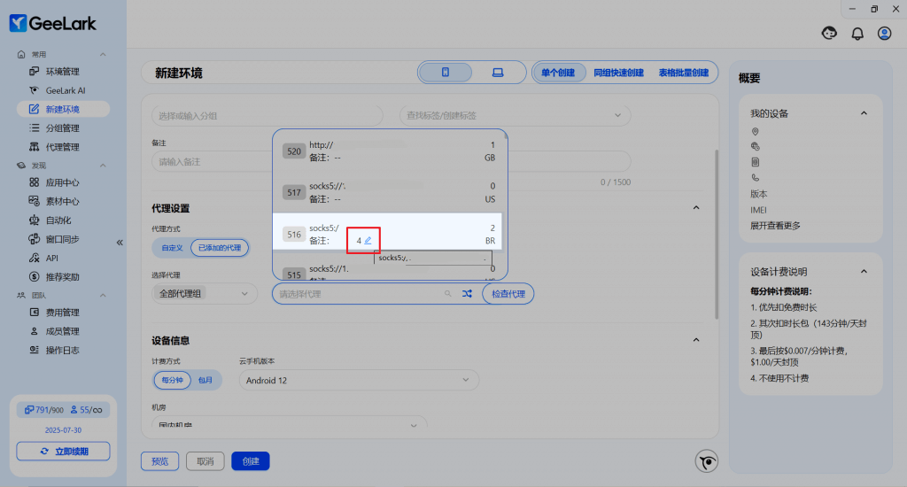在 GeeLark 最新版本中,現(xiàn)可通過“新建環(huán)境”中選擇代理時(shí)快捷修改備注信息,便于后期無需逐項(xiàng)檢查,確保團(tuán)隊(duì)信息同步。