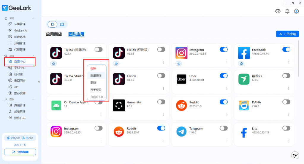 在最新版本中,“應(yīng)用中心”一欄的團(tuán)隊(duì)?wèi)?yīng)用中,你可以通過點(diǎn)擊應(yīng)用右下角,選擇批量操作的快捷功能。包括批量啟動、批量關(guān)閉、批量重啟和批量卸載。