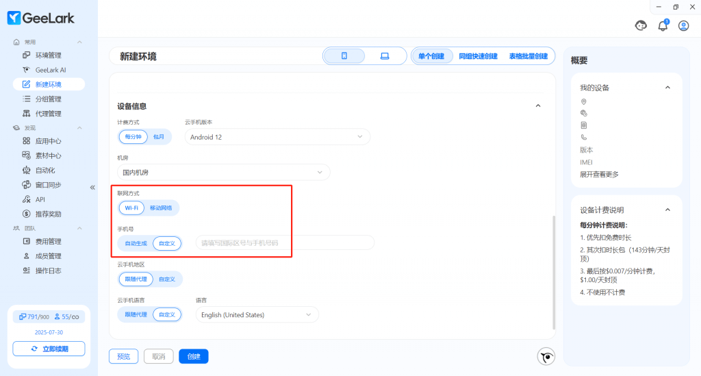 同時(shí),在新建環(huán)境中支持自定義手機(jī)號,你可以根據(jù)代理位置填寫對應(yīng)的國際區(qū)號,形成更加準(zhǔn)確的云手機(jī)環(huán)境設(shè)置,還原真實(shí)用戶信息場景。