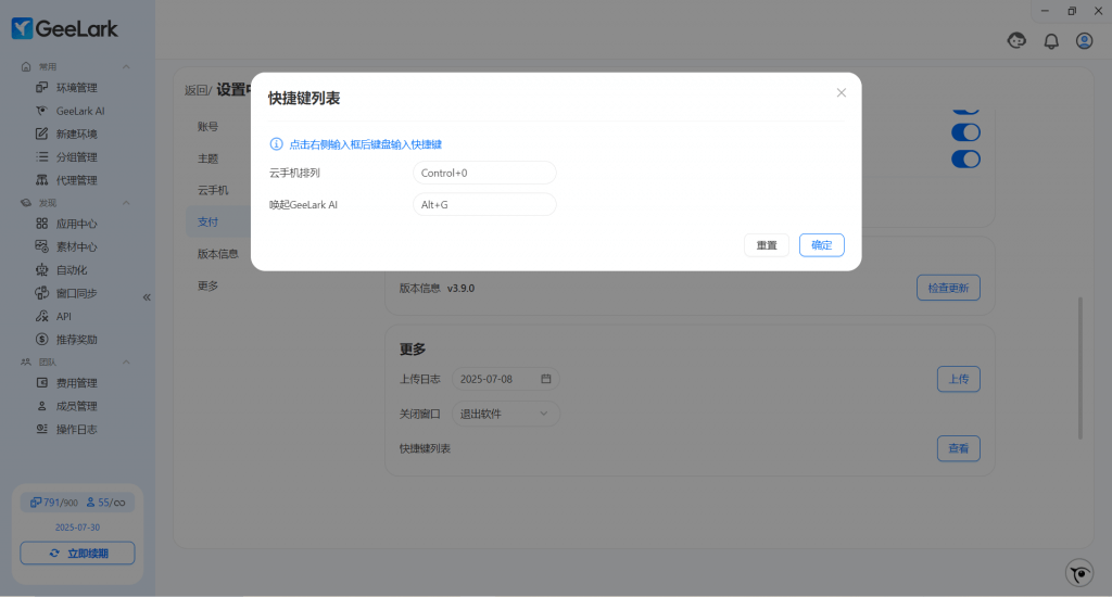 你可以通過右上角頭像-點(diǎn)擊設(shè)置中心-快捷鍵列表中自定義設(shè)置云手機(jī)排列和喚起 GeeLark AI 的快捷鍵。