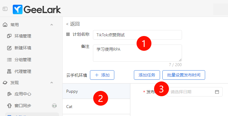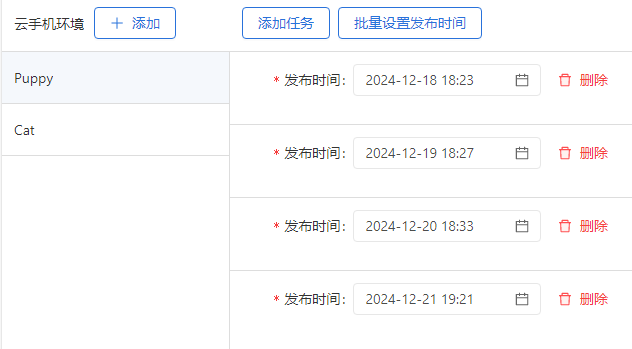 3-【添加任務(wù)】:為云手機(jī)環(huán)境設(shè)置不同的執(zhí)行時間,例如,為云手機(jī)環(huán)境“Puppy”設(shè)置不同的任務(wù)執(zhí)行時間。