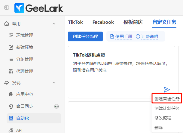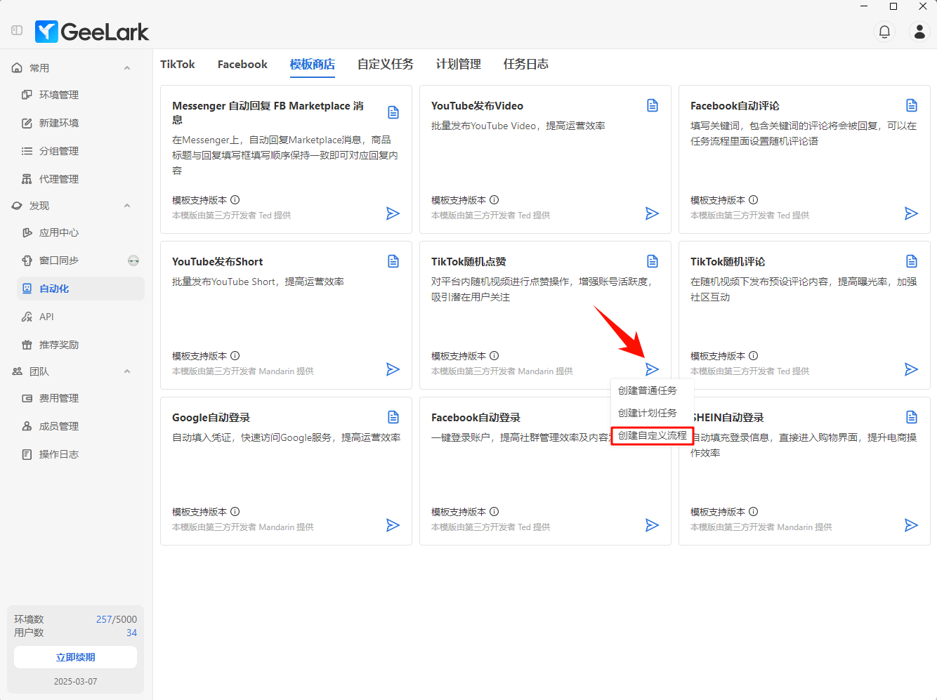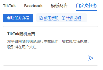 選擇體驗(yàn)【TikTok隨機(jī)點(diǎn)贊】這個模板,選擇【創(chuàng)建自定義流程】