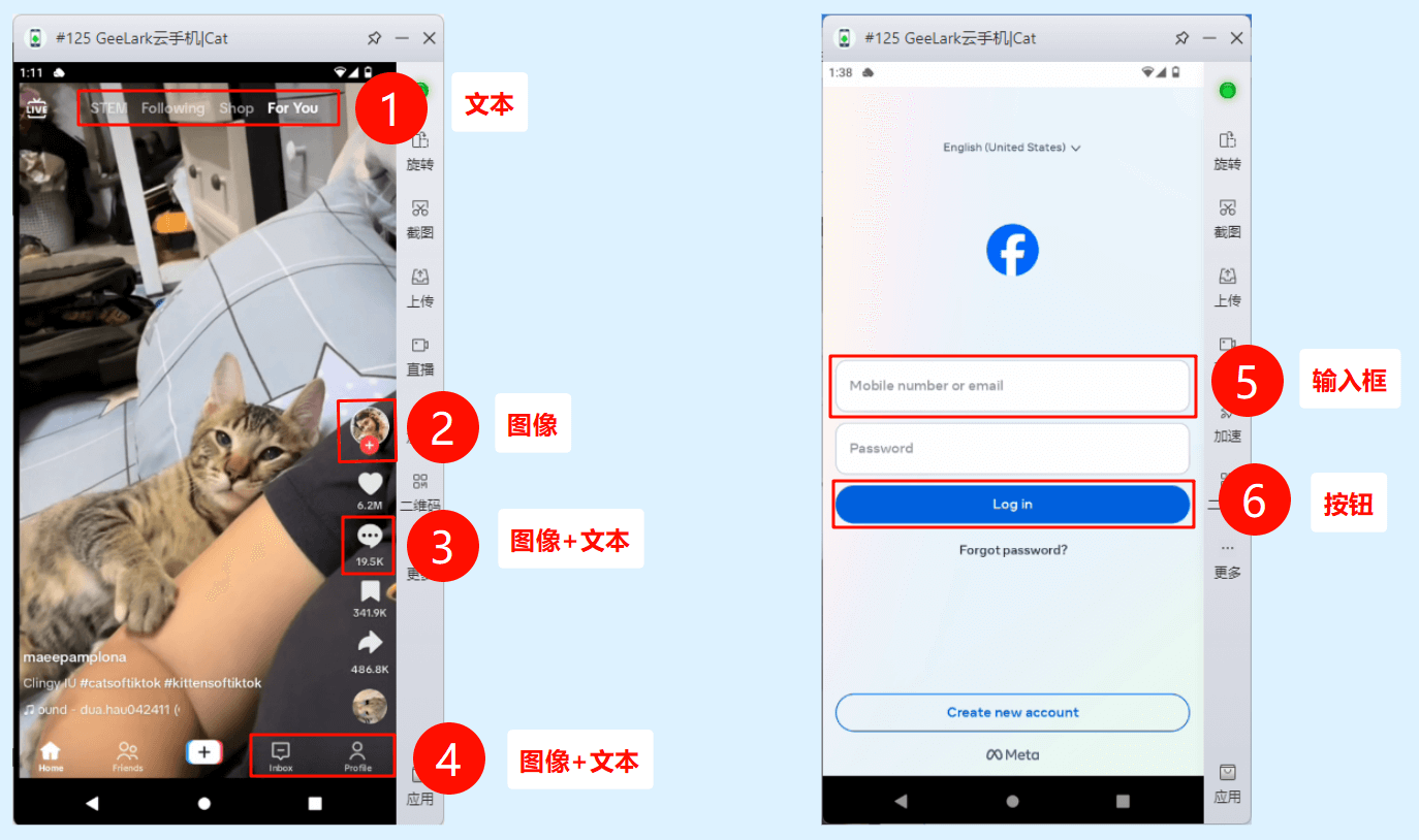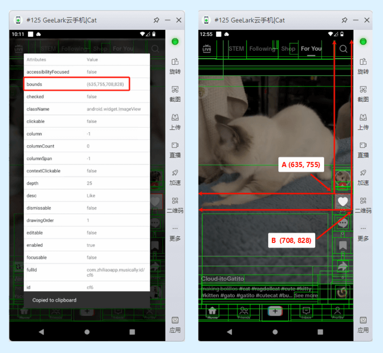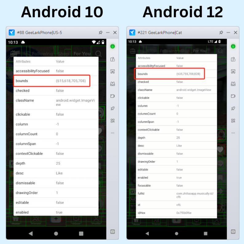 由于不同系統(tǒng)的云手機(jī)分辨率可能存在差異,同一個(gè)控件在不同設(shè)備上的坐標(biāo)有可能會有所不同。因此,如果你的 RPA 流程需要在多種機(jī)型上運(yùn)行,請務(wù)必測試多套坐標(biāo)。例如,你在 Android 10 上點(diǎn)擊的是“Like”圖標(biāo),但在 Android 12 上,使用相同的坐標(biāo)可能會誤點(diǎn)擊到“Comment”圖標(biāo)。