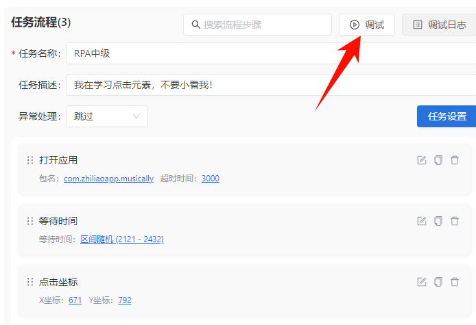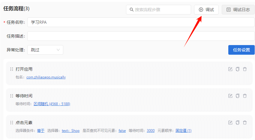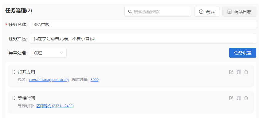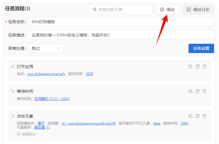 步驟一:先創(chuàng)建一個(gè)RPA模板,添加打開TikTok APP、等待時(shí)間的步驟(如果你還不會,可以從RPA初級開始學(xué)習(xí))。