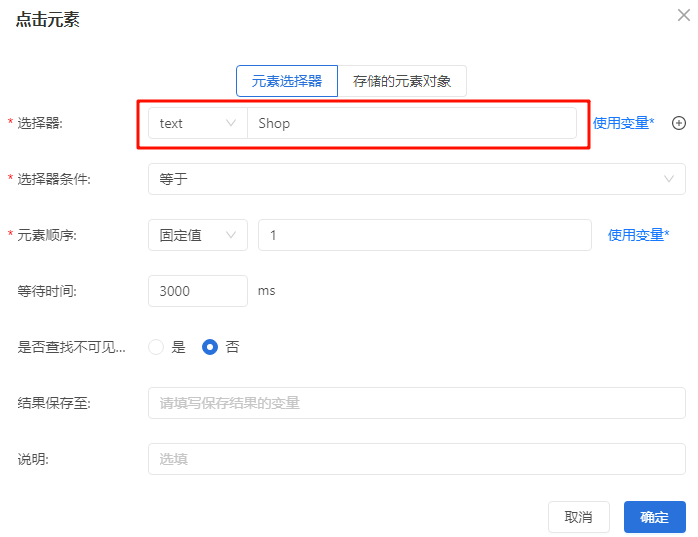 等待時(shí)間 | 指定尋找目標(biāo)元素的最大等待時(shí)間(單位:毫秒)。頁面加載較慢時(shí),適當(dāng)增加等待時(shí)間(如5000ms) |