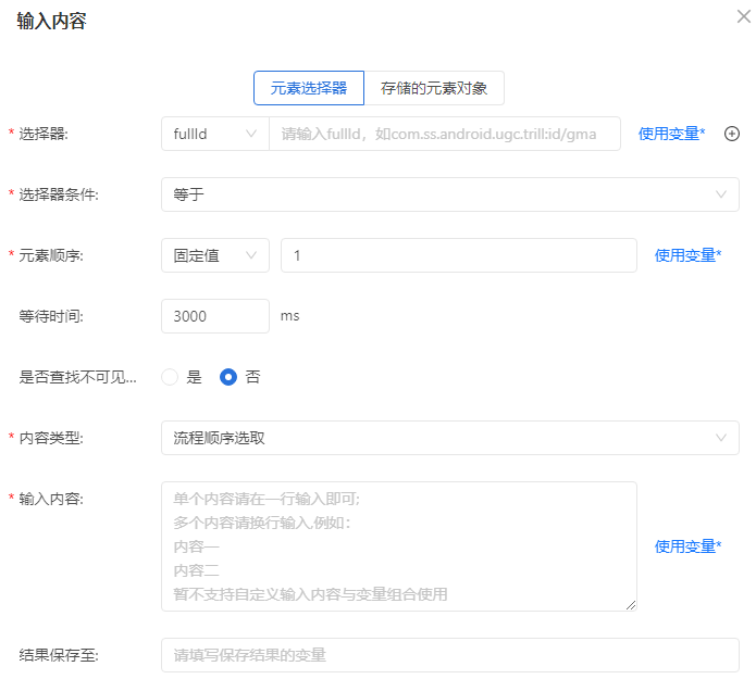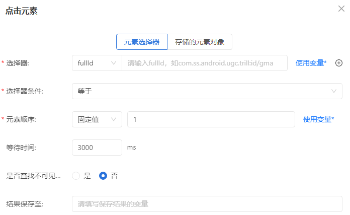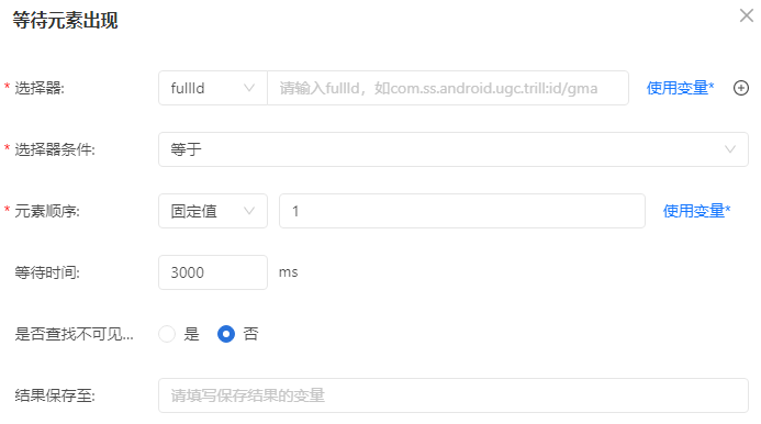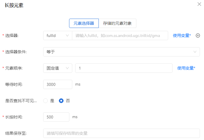是否查找不可見元素 | 控制是否可以查找屏幕上看不到的元素(如隱藏元素或需要滾動的內(nèi)容)。 - 點(diǎn)擊需要滾動才能顯示的按鈕時(shí),選擇“是”。 - 只操作當(dāng)前屏幕上的內(nèi)容時(shí),選擇“否”。一般我們都是長按當(dāng)前屏幕上的內(nèi)容,所以默認(rèn)選“否”就行 |