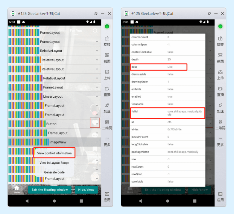 步驟3:向下滾動界面,查找與“Like”按鈕對應(yīng)的控件信息。當(dāng)某個(gè)控件的顏色比其他控件更深時(shí),說明它正是當(dāng)前選中的控件,例如“Like”圖標(biāo)對應(yīng)的控件。這種高亮顯示可以幫助你快速定位目標(biāo)控件。