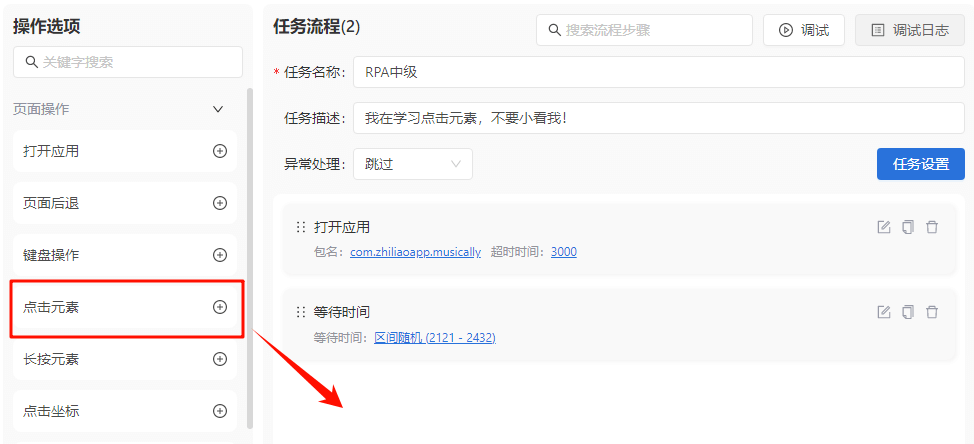 步驟5:搭建一個(gè)可以測試的最簡單流程,在第 3 步中選擇 【點(diǎn)擊元素】 操作。