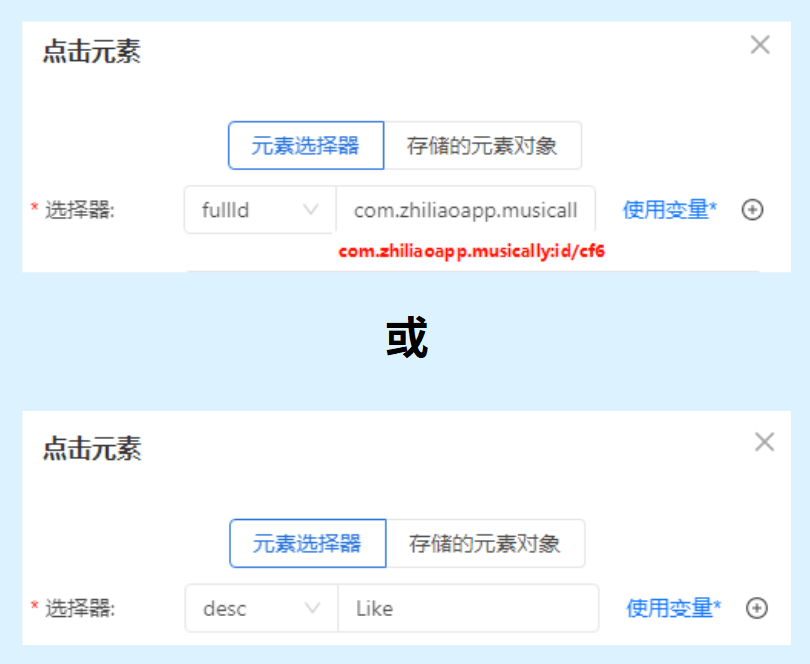 在使用 【點(diǎn)擊元素】 時(shí),選擇器可以設(shè)置為 fullId 或 desc,并且填上你在AutoX.js中查看到的屬性值。