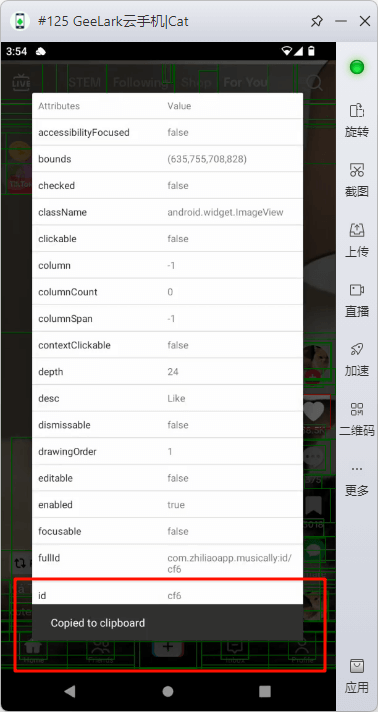 小技巧:當(dāng)你點(diǎn)擊某個(gè)屬性值的時(shí)候,會復(fù)制如下格式的文本:fullId("com.zhiliaoapp.musically:id/cf6")、className("android.widget.ImageView"),我們只需要填寫引號里面的值即可。