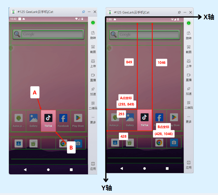 在開始操作之前,我們先了解Android 手機(jī)的坐標(biāo)體系。如圖所示,A 和 B 兩個(gè)點(diǎn)的坐標(biāo) (X, Y) 。
