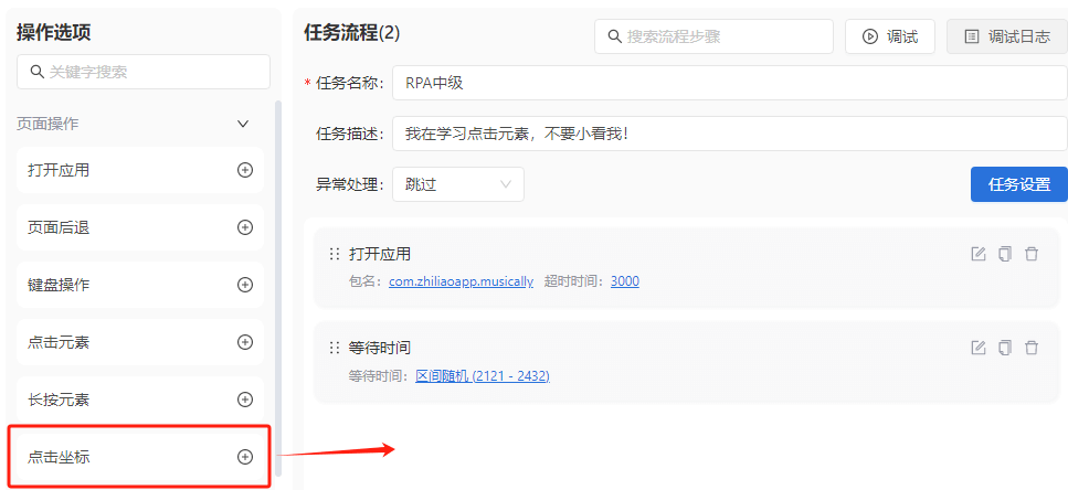 步驟4:搭建一個(gè)可以測試的最簡單流程,在第 3 步中選擇 【點(diǎn)擊坐標(biāo)】 操作。